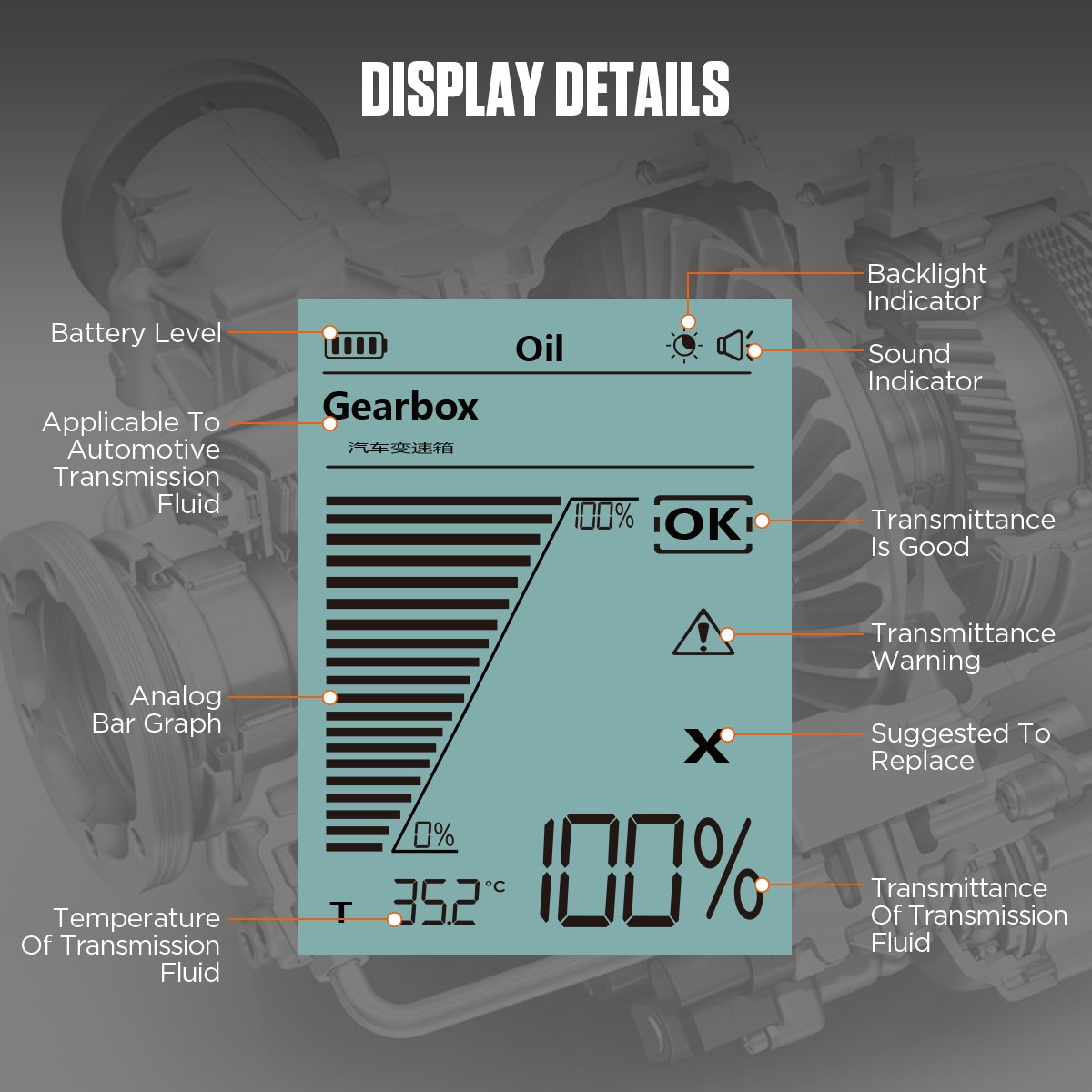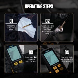 Detta gör det möjligt för testaren att upptäcka föroreningar, kontaminanter eller sediment i oljan, vilket ger en bedömning av oljans renhet och skick. Sonden mäter graden av absorption och spridning av ljus i växellådsoljan och fastställer förekomsten av främmande ämnen utifrån förändringar i ljusgenomsläppligheten.